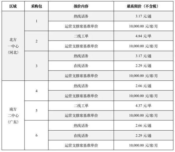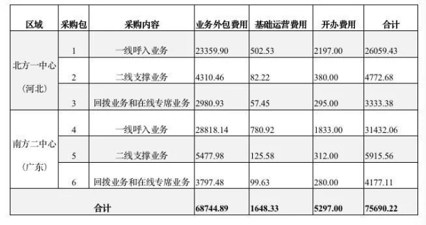 公告顯示,項(xiàng)目采購總預(yù)算為75690.22萬元(不含稅),其中包含業(yè)務(wù)外包費(fèi)用68744.9萬元、基礎(chǔ)運(yùn)營費(fèi)用1649萬元、開辦費(fèi)5297萬元。項(xiàng)目按業(yè)務(wù)類型和區(qū)域共劃分六個(gè)采購包。
