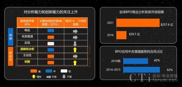 隨著云計算、大數(shù)據(jù)、人工智能時代的來臨,服務(wù)領(lǐng)域從過去的傳統(tǒng)模式發(fā)展為智慧模式,同時業(yè)務(wù)流程服務(wù)外包也呈現(xiàn)出四大發(fā)展新趨勢。成本驅(qū)動逐步向客戶和技術(shù)創(chuàng)新驅(qū)動轉(zhuǎn)變。對于外包商而言,價格不再是挑選供應(yīng)商的決定性條件,客戶體驗和相應(yīng)的支持能力躍升為主要的考量標(biāo)準(zhǔn);外包的業(yè)務(wù)類型也從以勞動力密集型為主,轉(zhuǎn)向供應(yīng)商的業(yè)務(wù)流程創(chuàng)新和附加值的創(chuàng)造能力。從服務(wù)商的角度來看,基于價格的規(guī)模經(jīng)濟(jì)不再能成為強(qiáng)有力的競爭手段,而客戶業(yè)務(wù)流程的自動化、客戶體驗的投入支持成為服務(wù)商最新關(guān)注的焦點(diǎn)。