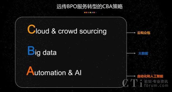 我們說科技發(fā)展是一把雙刃劍,物競天擇,適者生存,只有不斷地探索轉(zhuǎn)型才能激流勇進(jìn)。關(guān)于遠(yuǎn)傳技術(shù)的BPO服務(wù)轉(zhuǎn)型策略,可以簡單地概括為CBA策略。