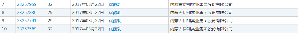 2017年3月22日,伊利向商標局提交了4件商標的注冊申請,分別是第23257569號與第23257741號“優(yōu)酸乳及圖”商標、第23257830號與第23257959號“優(yōu)酸乳”商標,指定使用在乳酸飲料(果制品,非奶)、牛奶制品、水(飲料)、煉乳等商品上。