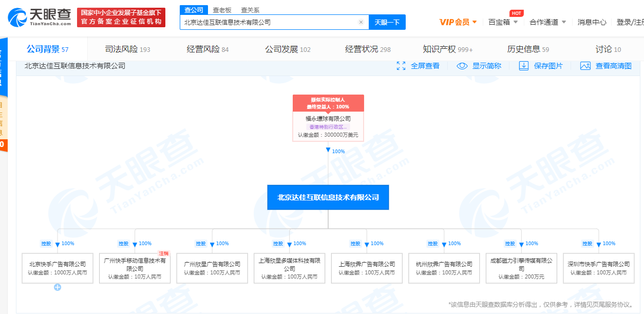 此外,根據(jù)天眼查資料,北京達(dá)佳互聯(lián)信息技術(shù)有限公司成立于2014年7月,注冊(cè)資本30億美元,法定代表人為楊遠(yuǎn)熙。股權(quán)穿透圖顯示,該公司對(duì)北京快手廣告有限公司、廣州快手移動(dòng)信息技術(shù)有限公司、深圳市快手廣告有限公司、成都磁力引擎?zhèn)髅接邢薰镜榷鄠€(gè)公司持股100%。