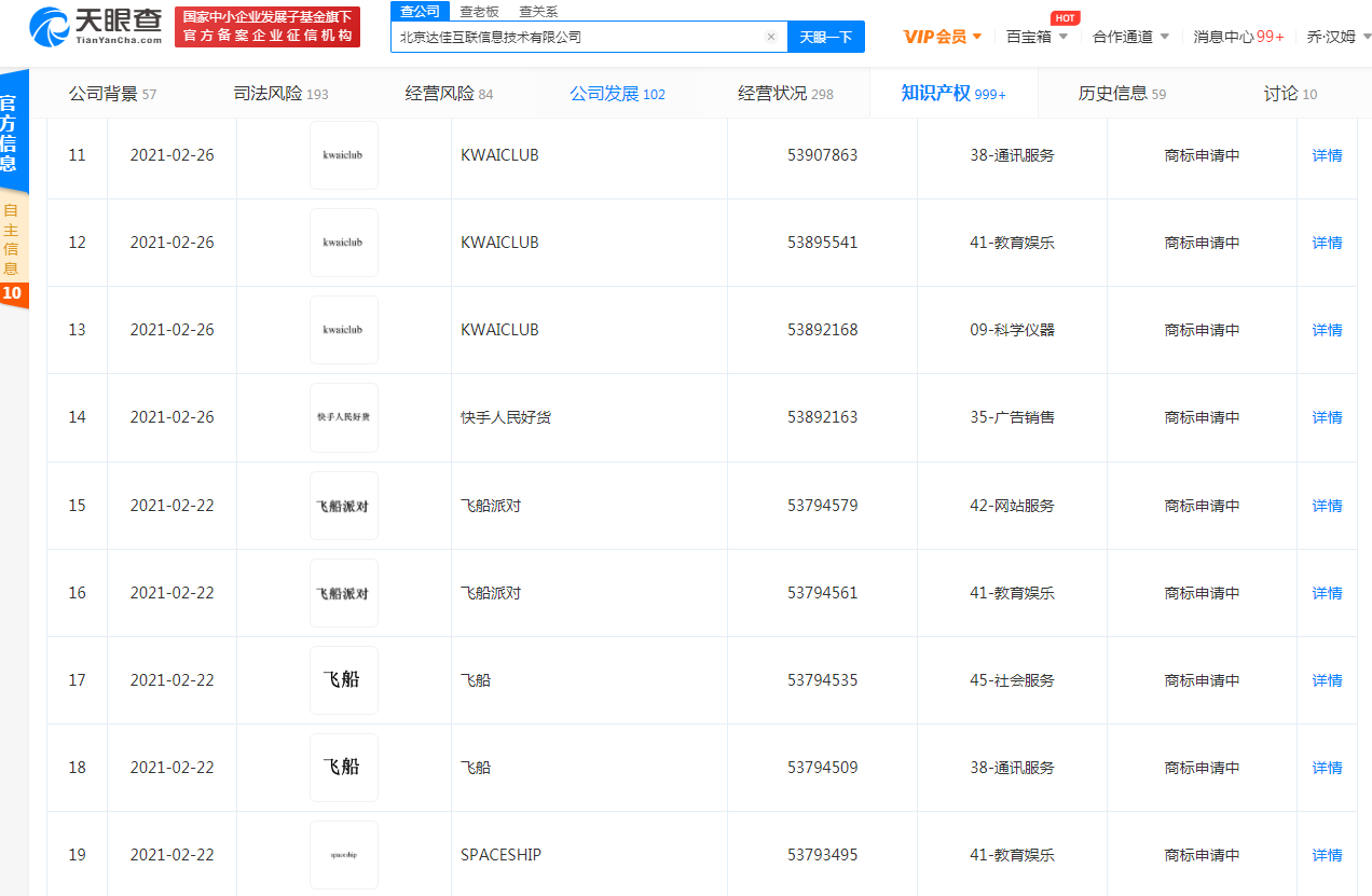 此前2月22日,該公司申請(qǐng)注冊(cè)“飛船”、“飛船派對(duì)”商標(biāo),國(guó)際分類涉及網(wǎng)站服務(wù)、教育娛樂(lè)、通訊服務(wù)、廣告銷售等,狀態(tài)均為“商標(biāo)申請(qǐng)中”。同時(shí),2月26日,還申請(qǐng)注冊(cè)多個(gè)“KWAICLUB”和“快手人民好貨”商標(biāo),涉及通訊服務(wù)、教育娛樂(lè)、廣告銷售等,狀態(tài)均為“商標(biāo)申請(qǐng)中”。