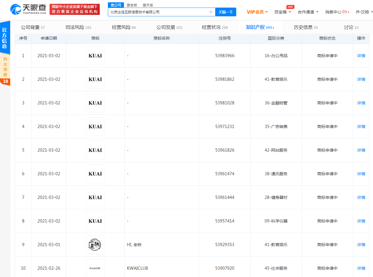 近日,快手關(guān)聯(lián)公司北京達(dá)佳互聯(lián)信息技術(shù)有限公司申請(qǐng)注冊(cè)多個(gè)商標(biāo),包括“KUAI”、“HI,老鐵”,國(guó)際分類涉及辦公用品,教育娛樂(lè)、金融物管、廣告銷售、網(wǎng)站服務(wù)、健身器材等,狀態(tài)均為“商標(biāo)申請(qǐng)中”。