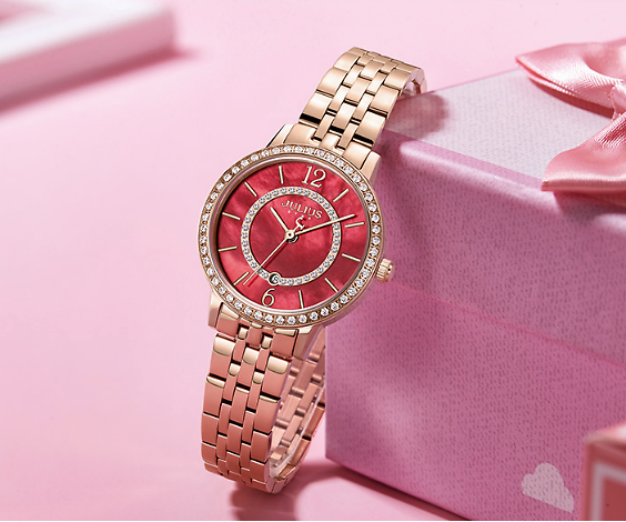 如果說(shuō)女人似水,溫柔嫻靜;那么女人也可如火焰,熱情張揚(yáng)。今年冬季,聚利時(shí)為我們帶來(lái)了一款設(shè)計(jì)驚艷的——復(fù)古幻彩珍珠貝鋯石女士腕表JS-051,天然珍珠貝面和同心圓嵌寶石設(shè)計(jì)相互輝映,呈現(xiàn)流光溢彩的曼妙奢華。設(shè)計(jì)師還在其中注入了更具動(dòng)感的“復(fù)古紅”元素,讓手表在女性腕間綻放活力四射的光彩,熱情又張揚(yáng)。