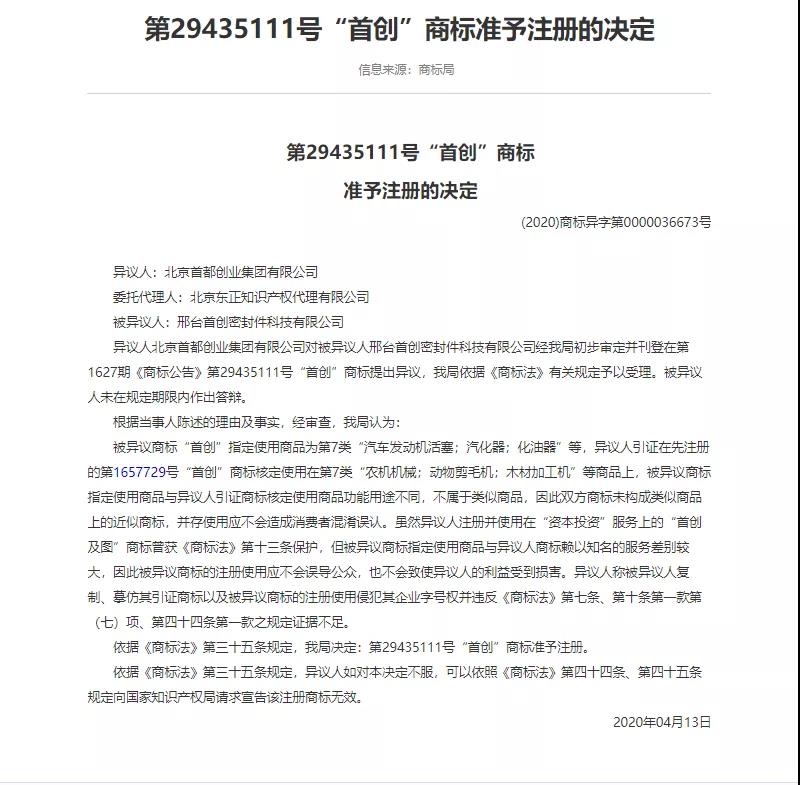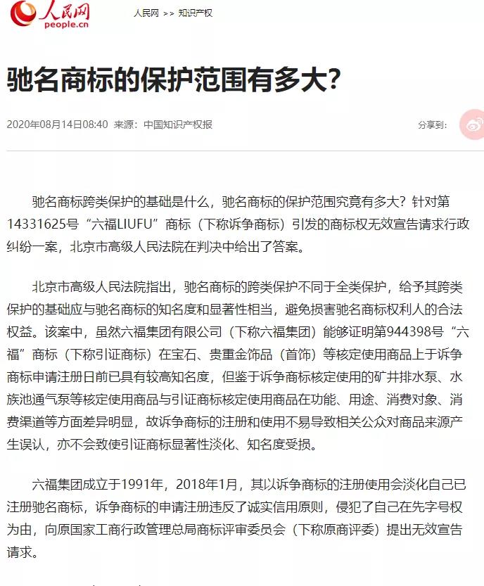 從法條規(guī)定的字面含義來(lái)看,很容易認(rèn)為馳名商標(biāo)應(yīng)當(dāng)予以全類(lèi)保護(hù)。然而,馳名商標(biāo)跨類(lèi)保護(hù)是受到“誤導(dǎo)公眾”這一條件的嚴(yán)格限制。商標(biāo)法的立法本意在于通過(guò)授予商標(biāo)權(quán)人在其商標(biāo)使用行為所產(chǎn)生的知名度所能輻射的范圍內(nèi)以專(zhuān)有使用權(quán)保護(hù),從而降低消費(fèi)者的搜尋成本,維護(hù)社會(huì)公共利益。如果不存在誤導(dǎo)可能性,即便認(rèn)定為商標(biāo)馳名,亦不具有排斥他人之效力。這個(gè)從上面的圖片中,人民日?qǐng)?bào)轉(zhuǎn)載的中國(guó)知識(shí)產(chǎn)權(quán)報(bào)的一篇文章就知道,也能從商評(píng)委的第29435111號(hào)文件查到一些信息;