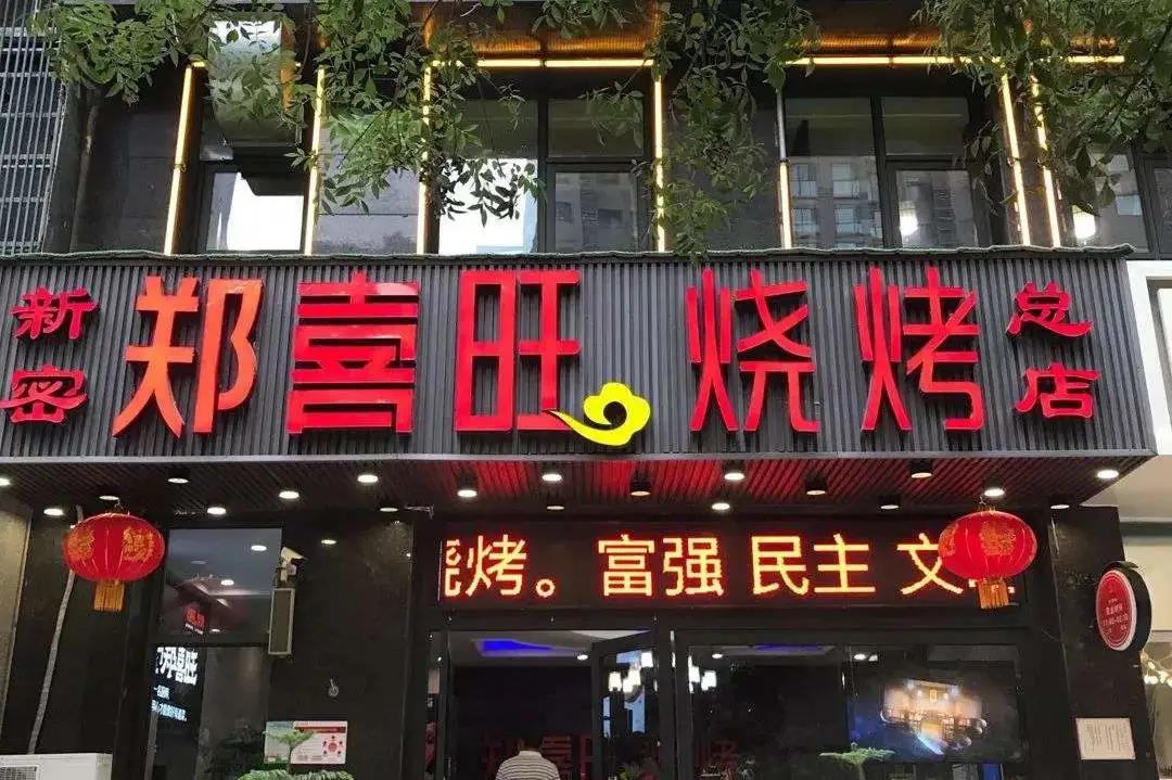 仔細(xì)看“鄭喜旺燒烤店”的招牌:黑底紅字,在鄭喜旺和燒烤二字的中間標(biāo)注了一個(gè)小小的“R”。