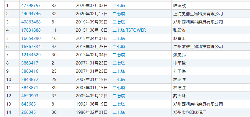 即便如此,記者發(fā)現(xiàn),仍然有一些企業(yè)和個(gè)人,注冊(cè)有“二七塔”關(guān)聯(lián)商標(biāo)。
