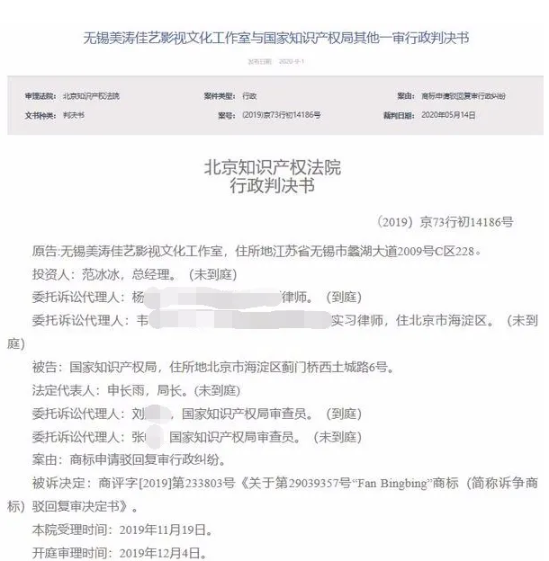 這份判決書是9月1日發(fā)布的,判決日期是今年的5月14日,裁判書顯示原告系范冰冰的公司——無錫美濤佳藝影視文化工作室,被告是國家知識產(chǎn)權(quán)局,案由為商標(biāo)申請駁回復(fù)審行政糾紛。