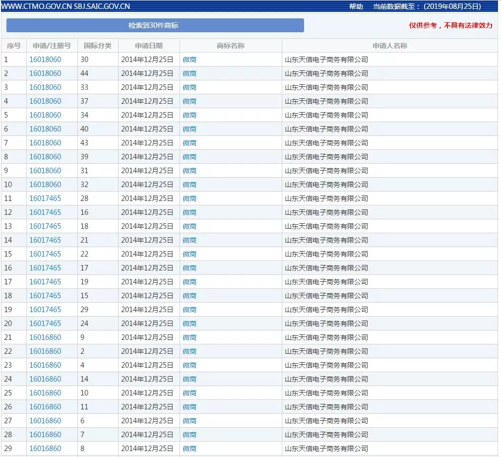 自媒體網(wǎng)友風(fēng)雷麥子發(fā)朋友圈,“按理說,中國做微商最好的,都是在廣東、深圳這樣的南方城市,可大多數(shù)微商公司,都忙著產(chǎn)品變現(xiàn)了,忽略了商標的重要性,結(jié)果“微商”這個商標,竟被山東濟南的一家叫“天信電子商務(wù)公司”給注冊了去。騰訊公司也想要這個商標,結(jié)果申訴被駁回,按照騰訊財大氣粗,習(xí)慣用錢來搞定一切的風(fēng)格,不知道會不會直接花錢買下這個商標呢。