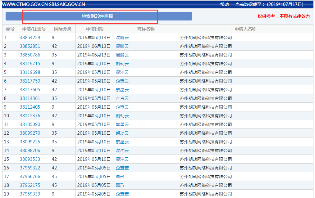 不過也不能說他們沒作為,只是有點(diǎn)晚了,到2019年6月6日才申請(qǐng)注冊(cè)了35類和42類的“查公司 查老板 查關(guān)系”商標(biāo),目前還在實(shí)質(zhì)審查階段,所以不算持有該商標(biāo),也就不能以商標(biāo)侵權(quán)為由起訴了。
