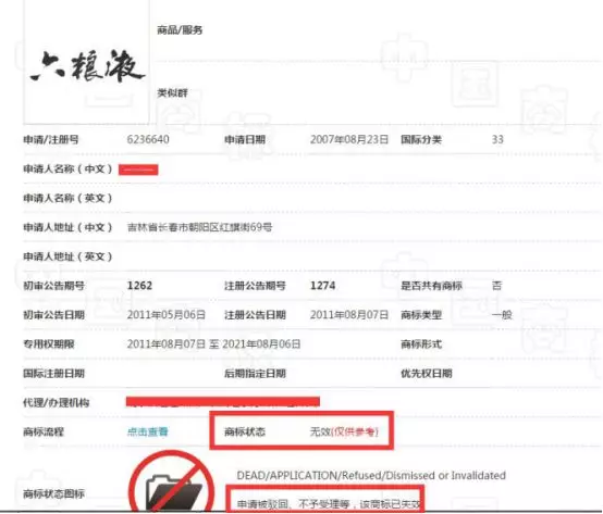 小知找了一個2007年8月23日申請的“六糧液”商標,這個商標在2011年的時候已經(jīng)注冊成功,但是現(xiàn)在顯示的商標狀態(tài)是無效。
