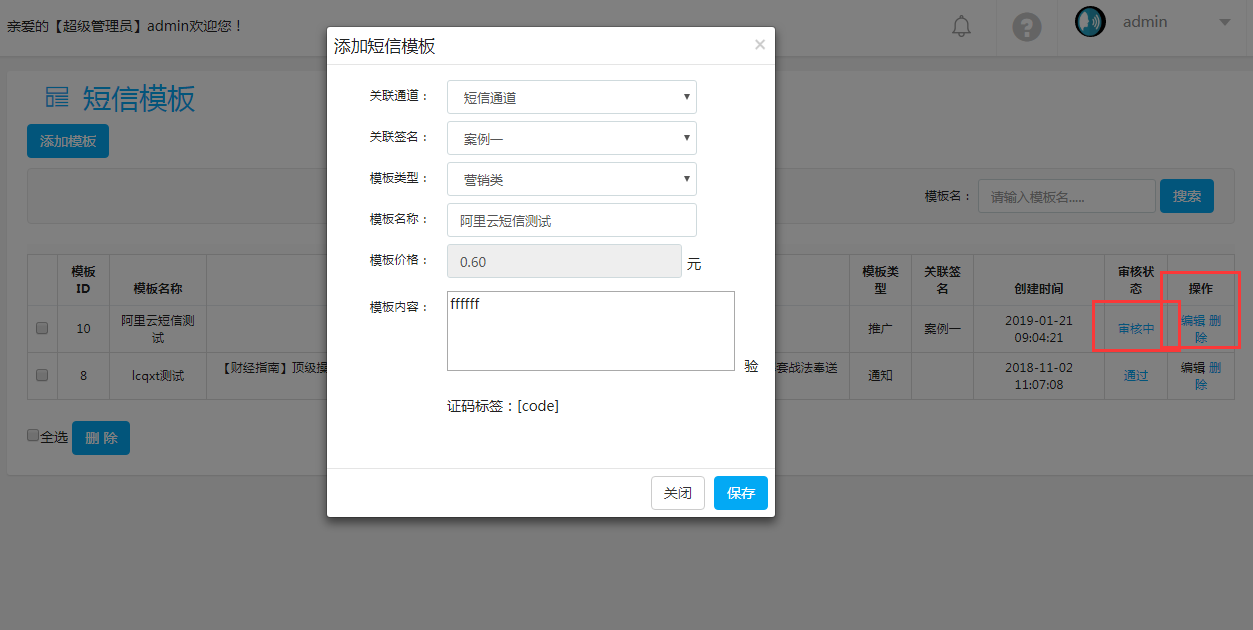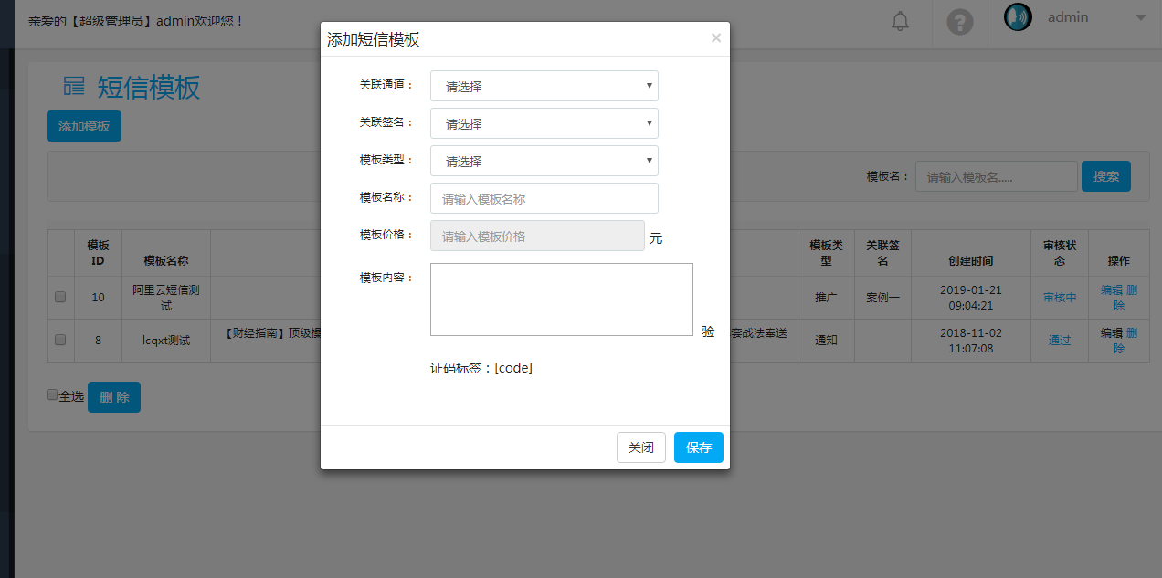 單擊“添加模板”按鈕,彈出編輯短信模板對話框,填寫必要信息后,點(diǎn)擊“保存”按鈕即可。
