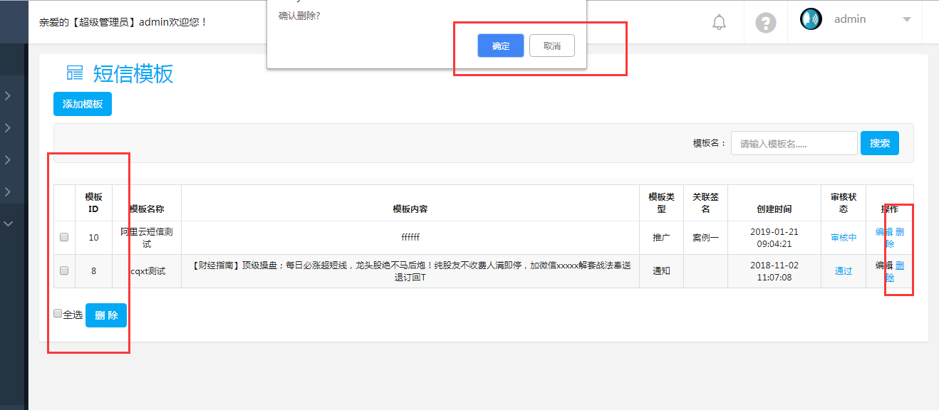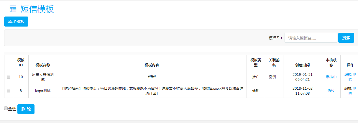 右側(cè)菜單-短信管理-短信模板,點(diǎn)擊進(jìn)入短信管理界面