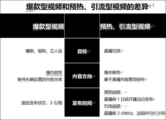 我們經??吹奖钜曨l,那么什么是預熱,引流視頻?帳號內容和我們正常運作的內容有什么區(qū)別?見表: