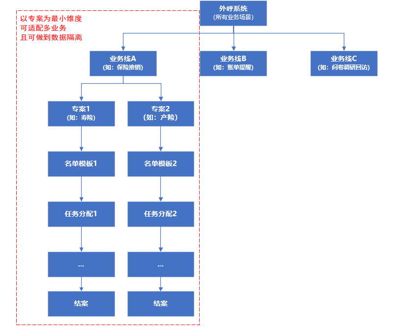 專案管理指:管理某一特定類型的外呼任務(wù),比如:保險行業(yè)中監(jiān)管要求的某一險種的外呼回訪和房地產(chǎn)行業(yè)中某一樓盤推銷的外呼,業(yè)務(wù)不一樣,外呼的內(nèi)容和相關(guān)的規(guī)則不一樣,就需要單獨的管理。