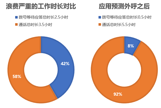 號(hào)碼批次質(zhì)量是所有外呼工作中的重要影響因素,但是在大多數(shù)情況下,號(hào)碼批次質(zhì)量并不高,這時(shí)就需要發(fā)揮預(yù)測(cè)外呼技術(shù)功能。在實(shí)際客戶(hù)案例中,遠(yuǎn)傳科技U-IPCC預(yù)測(cè)外呼可將座席平均3.5小時(shí)/天有效通話時(shí)間提升到每天5.5小時(shí)/天,1個(gè)人干完1.6個(gè)人的活,效率提升157%。