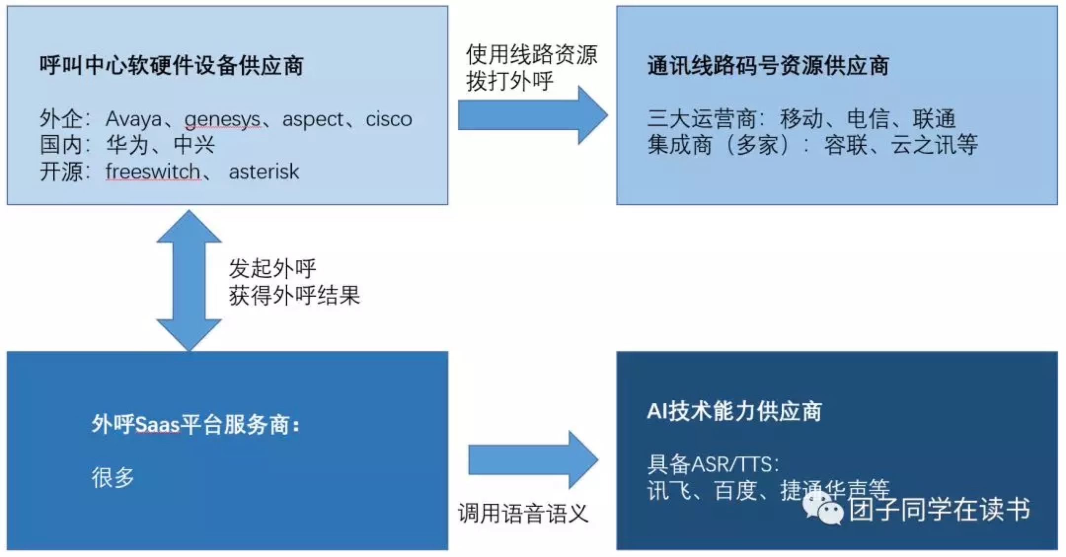 對(duì)于只有NLU能力的廠商來說局面也是一樣,除了需要接入ASR/TTS的能力,還需要去尋找可以合作的呼叫中心,并且想辦法拿到盡可能低的話費(fèi)報(bào)價(jià)。
