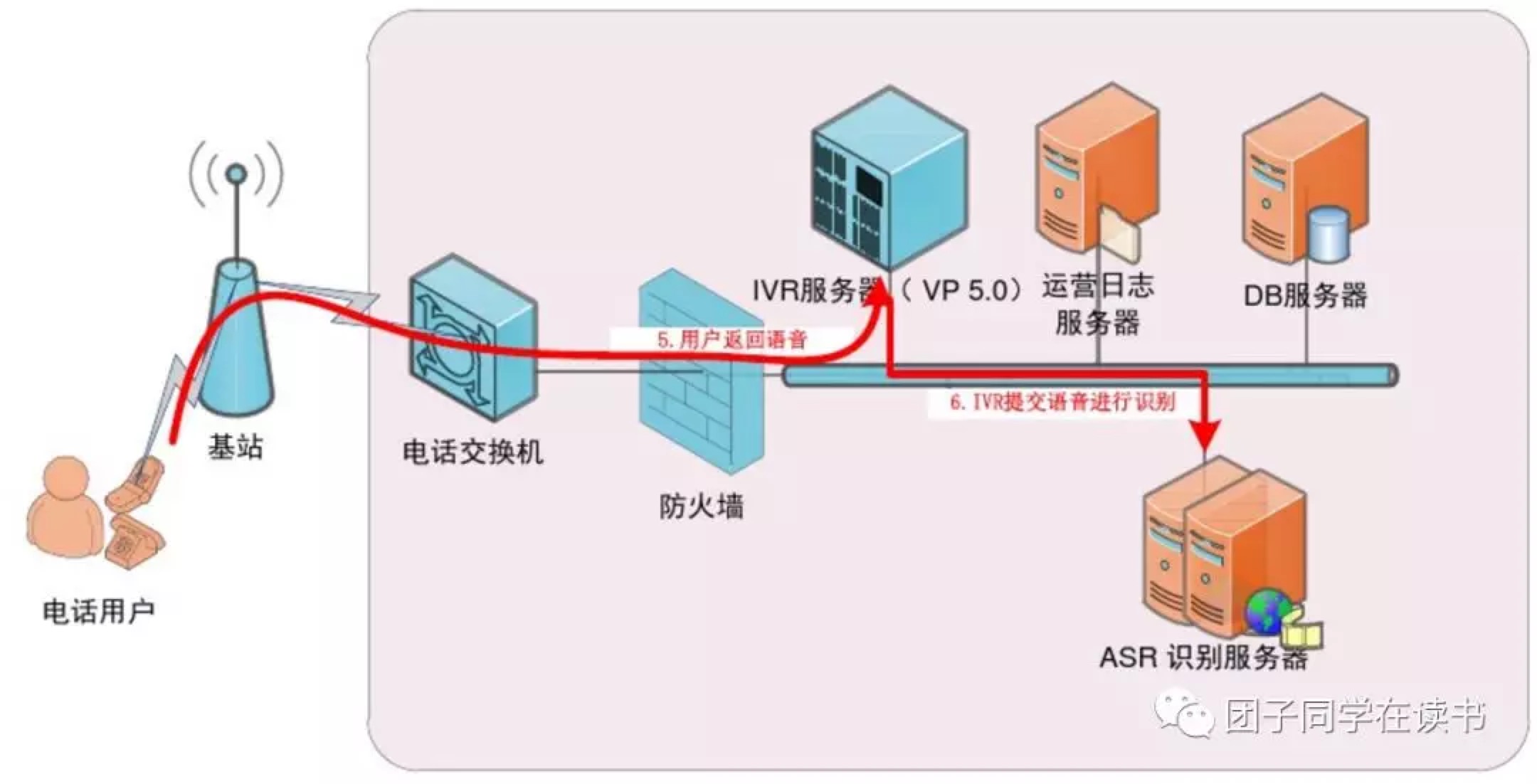 流程:A→PSTN→PBX→IVR(→ASR→NLU)→ACD(→ASR→NLU→DM→NLG→TTS)→ACD→B