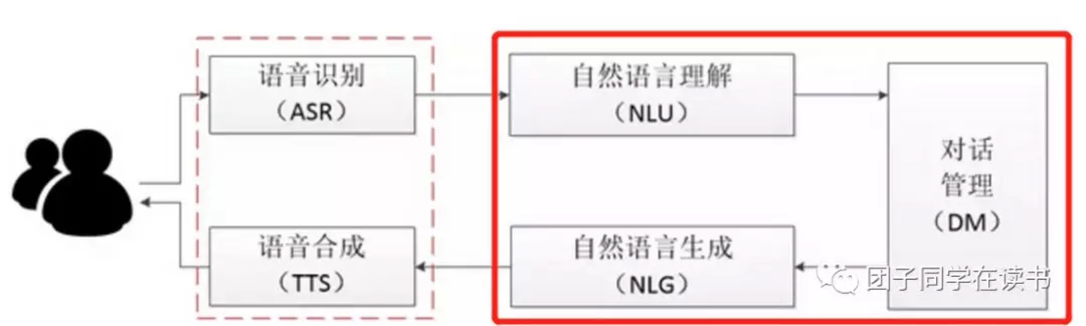 準(zhǔn)確來說,一個(gè)簡(jiǎn)單的對(duì)話機(jī)器人系統(tǒng)框圖,包括語音識(shí)別(ASR)、語音合成(TTS)、自然語言理解(NLU)、對(duì)話管理(DM)、自然語言生成(NLG)幾個(gè)模塊組成。而這一部分就是智能外呼系統(tǒng)的主流玩家——NLU類(智能客服)廠商的強(qiáng)項(xiàng)了。