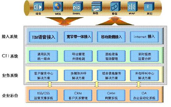 呼叫中心分為以下幾個(gè)系統(tǒng),分別為:接入系統(tǒng),CTI系統(tǒng),坐席系統(tǒng),運(yùn)營(yíng)管理系統(tǒng)及業(yè)務(wù)系統(tǒng)。按功能分為四層結(jié)構(gòu),分別為接入層,CTI層,業(yè)務(wù)層和企業(yè)后臺(tái)部分。