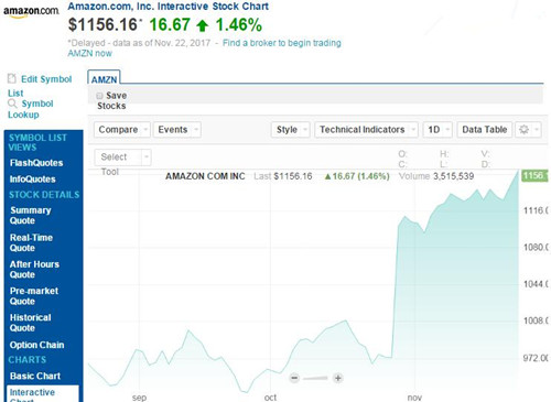 感恩節(jié)之前的本周三美國股市收盤時,亞馬遜股價為1156. 16 美元,較前一交易日1139. 49 美元的收盤價上漲了16. 67 美元,漲幅為1.46%,股價也再次創(chuàng)下新高。