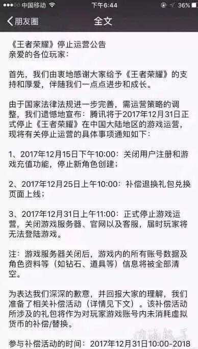據(jù)悉,前不久網(wǎng)絡(luò)上出現(xiàn)一篇名為“王者榮耀停止運(yùn)營(yíng)公告”的消息,消息稱(chēng)“騰訊將于 2017 年 12 月 31 日正式停止《王者榮耀》在中國(guó)大陸地區(qū)的游戲運(yùn)營(yíng)?!惫嬷羞€稱(chēng),將于 12 月 15 日關(guān)閉用戶(hù)注冊(cè)、游戲充值、角色創(chuàng)建功能; 12 月 25 日賠償退還禮包兌換頁(yè)面上線(xiàn)等等。