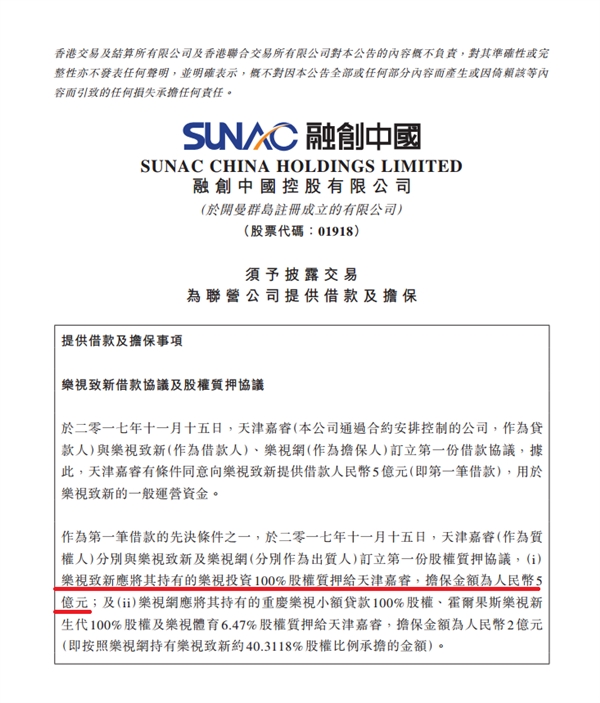 按照該公告, 2017 年 11 月 15 日,天津嘉睿(融創(chuàng)中國擺設控制的貸款人)與樂視致新(借款人)、樂視網(擔保人)簽訂第一份借款協議,天津嘉睿有條件向樂視致新提供借款人民幣 5 億元,用于樂視致新的一般運營資金。