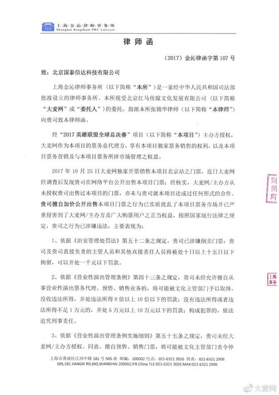 10 月 26 日晚間,大麥網(wǎng)發(fā)布聲明稱,大麥內(nèi)部已確認(rèn)無任何違規(guī)操作,而票牛、有票等二手票交易平臺的銷售行為,大麥網(wǎng)不知情也不認(rèn)同。目前甚至還有一些公然冒用大麥名義、或利用與大麥相同的公司地址混淆用戶認(rèn)知,加價(jià)進(jìn)行銷售,對大麥品牌造成侵害。并附上了兩封律師函。