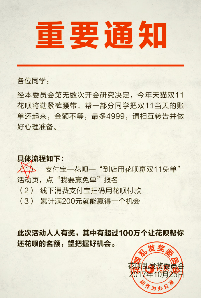 站長之家(Chinaz.com)10 月 25 日消息 為了讓剁手黨更好的買買買,支付寶花唄繼頒布頒發(fā)雙 11 花唄臨時提額之后,今日又推出了“到店用花唄贏雙十一免單”活動,最高可免4999 元。