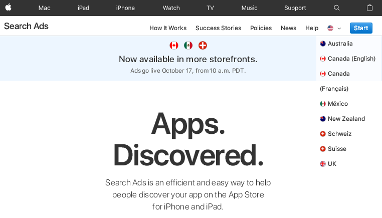 Ads將于10月17日新增加拿大、墨西哥、瑞士3國,蘋果搜索廣告自2016年9月29日上線美國,至今已在7個國家(美國、英國、澳大利亞、新西蘭、加拿大、墨西哥、瑞士)的App Store開放競價(jià)廣告。