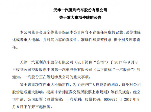 2017 年 9 月 8 日,中國(guó)第一汽車股份有限公司(簡(jiǎn)稱“一汽股份”)發(fā)布公告稱,一汽股份正在籌劃涉及公司的重大事項(xiàng)。公司股票(股票簡(jiǎn)稱:一汽夏利,股票代碼:000927)于下午開市起停牌。