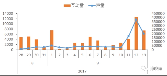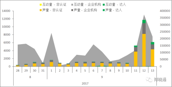 差別日期所產(chǎn)生的微博互動量和聲量(數(shù)據(jù)來源:博曉通)