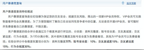 在世紀佳緣也有所謂的“用戶靠譜度”評價,按照世紀佳緣官網(wǎng)介紹,用戶靠譜度查詢是世紀佳緣為保證交友安適、規(guī)避交友風(fēng)險,推出的一項新VIP會員特權(quán), VIP會員可無限制查看異性會員靠譜度。其評分主要從資料可信度、賬號安適、交友真誠度、交友緊迫度、行為合規(guī)度 5 個方面考量, 100 分滿分制。