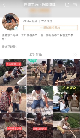 8 年前,陶津津因一次不測失去了右臂。通過家人的開導和陪伴,他漸漸從傷痛中走出來,開始在工地打工。一次偶然的機會,他開始通過快手記錄本身的工作和生活。他的自立自強打動了快手的無數用戶,現已擁有82. 6 萬粉絲。