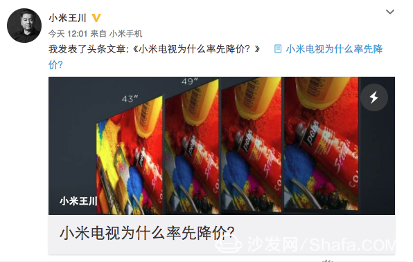 對于小米電視的大幅度降價(jià)很多人覺得受樂視事件的影響,智能電視市場即將面臨巨大危機(jī),各大廠商紛紛降價(jià)銷售的新聞層出不窮。近日,,小米科技聯(lián)合創(chuàng)始人、小米電視業(yè)務(wù)負(fù)責(zé)人王川今日通過微博發(fā)布一篇名為《小米電視為什么率先降價(jià)?》的長文。在這篇文章,王川談到目前上游原材料價(jià)格回落,及小米電視降價(jià)銷售的真正原因。