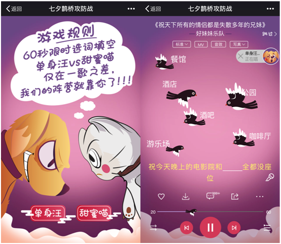 本年七夕拿下“首刷”的,就是來自酷狗音樂的一款七夕填歌詞H5。游戲由“單身狗”和“甜蜜喵”兩個陣營組成,無疑是代表兩種愛情狀態(tài)。兩種角色都需要通過歌詞填空來進行答題,答案由若干只“喜鵲”帶著,玩家需要從多個選項中找到正確的。差別的是,“甜蜜喵”答對一題,喜鵲就會釀成愛心狀,而“單身狗”答對一題便會射爆一只喜鵲,阻止鵲橋相會。