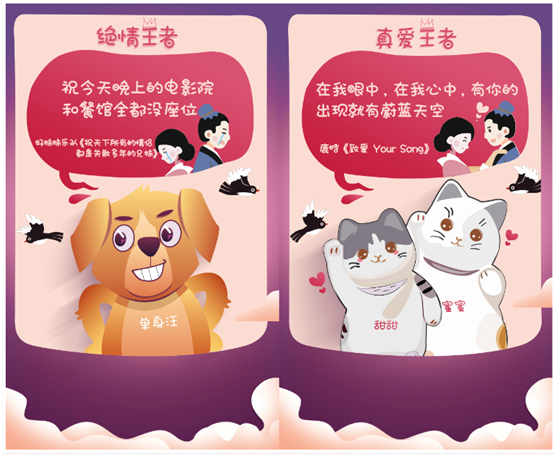 說到曲庫,酷狗這次的七夕H5 可以說是前段時間“就是歌多”廣告的延續(xù)。而這一波結合七夕節(jié)日,洞悉年輕人娛樂的參與感心理,將自身曲庫大的品牌訴求點巧妙地與“單身”“愛情”兩種角色的歌曲相結合,不但再次展示了本身的歌曲版權實力,也在年輕群體間形成了良好的品牌口碑。