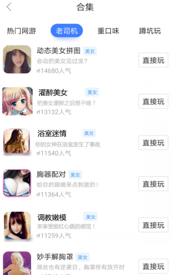 之所以說狗仔游戲盒子,是宅男過七夕必備利器,除了上面好玩的游戲多,能讓你在七夕徹底的爽一下之外,還有一個(gè)更重要的原因,就是里面專門有十幾款為宅男老司機(jī)準(zhǔn)備的游戲!