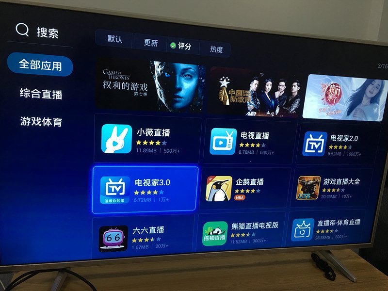 通過更新、評分、熱度標(biāo)簽來給應(yīng)用排序,這里集合了電視端所有的電視直播、體育直播、電競游戲直播應(yīng)用。例如選擇電視家3. 0 安置并運(yùn)行;