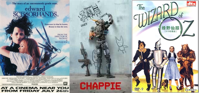 類似這樣的形象,之后在電影、小說(shuō)中反反復(fù)復(fù)的出現(xiàn),如電影《剪刀手愛(ài)德華》(1990)、《超能查派》( 2015 年)中,他們或者巴望戀愛(ài),或者巴望自由,或者巴望融入人類,或者巴望求證出“我是誰(shuí)”這個(gè)哲學(xué)命題,而演繹出一段段離合悲歡與人間喜劇。