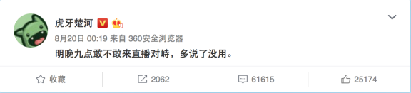 近日,從來不主動(dòng)參加虎牙營收活動(dòng)的主機(jī)一哥楚河,因被嗨氏粉絲激怒而參加了一次虎牙的沖榜活動(dòng),雙方粉絲直接開始了口水戰(zhàn)和禮物戰(zhàn),結(jié)果楚河超過嗨氏博得了榜單第一。