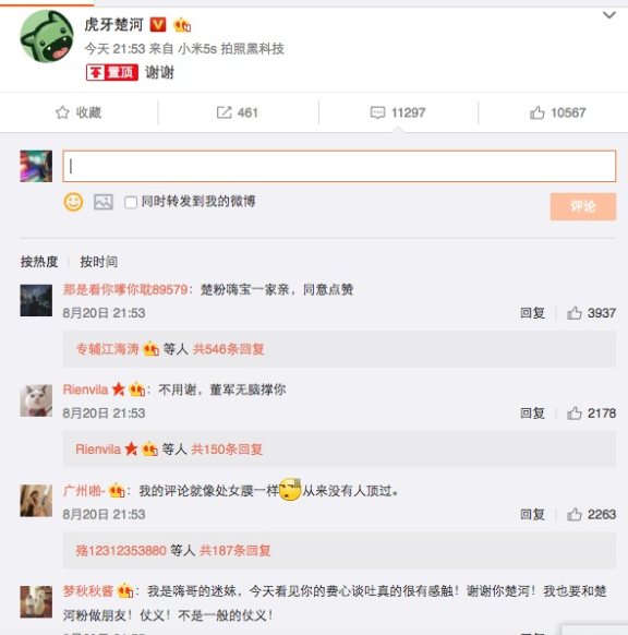 楚河在直播中幾次情緒失控,當(dāng)初水軍在直播間噴他生病的媽媽,又到微博私信罵他基友,連支持他的粉絲也受到攻擊,并說本身查過一個(gè)某魚的一個(gè)水軍用1800個(gè)號(hào)發(fā)了十幾萬條彈幕評(píng)論,兩方帶節(jié)奏。