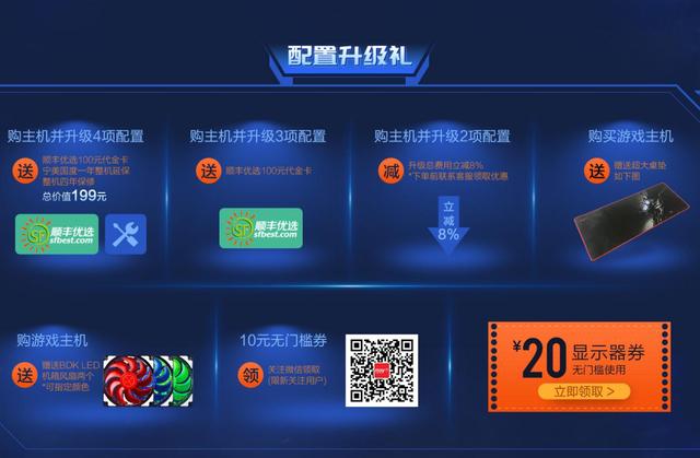 購主機并升級 4 項配置,送價值 199 元的順豐優(yōu)選 100 元代金卡和寧美國度一年整機延保,整機四年保修
