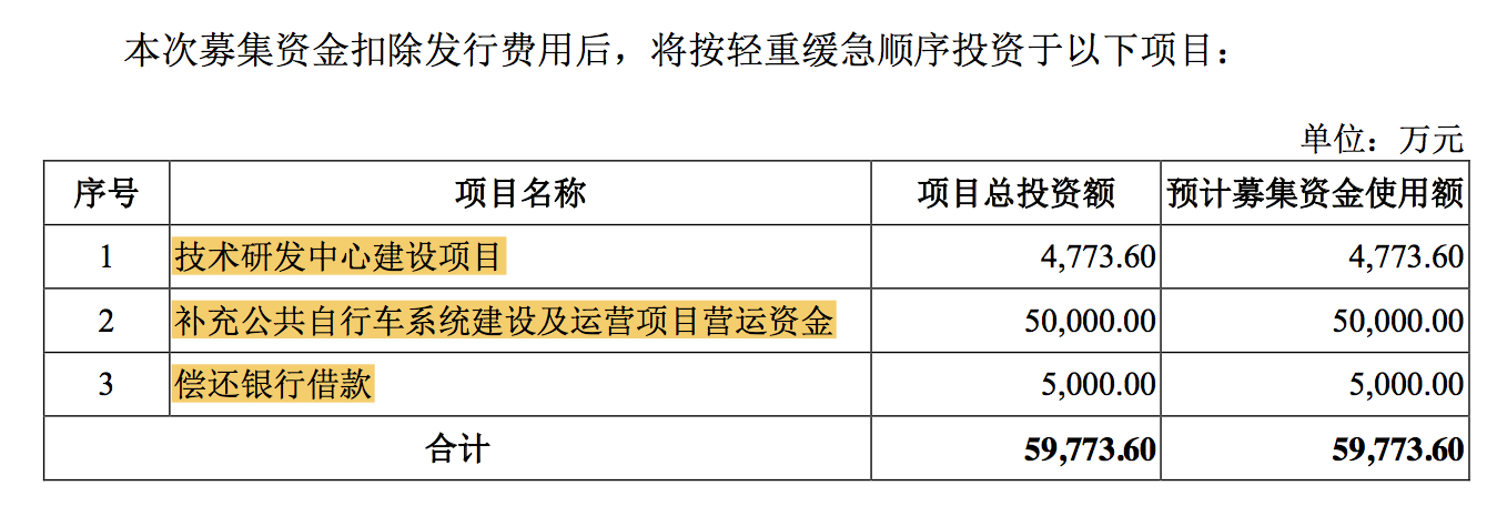 此次永安行IPO計(jì)劃發(fā)行 2400 萬(wàn)股,股票發(fā)行價(jià)26. 85 元,計(jì)劃募資5. 8 億元。其招股書(shū)顯示,永安行將募資用于技術(shù)研發(fā)中心建設(shè)項(xiàng)目、增補(bǔ)公共自行車(chē)系統(tǒng)建設(shè)及運(yùn)營(yíng)項(xiàng)目營(yíng)運(yùn)資金、償還銀行借款。