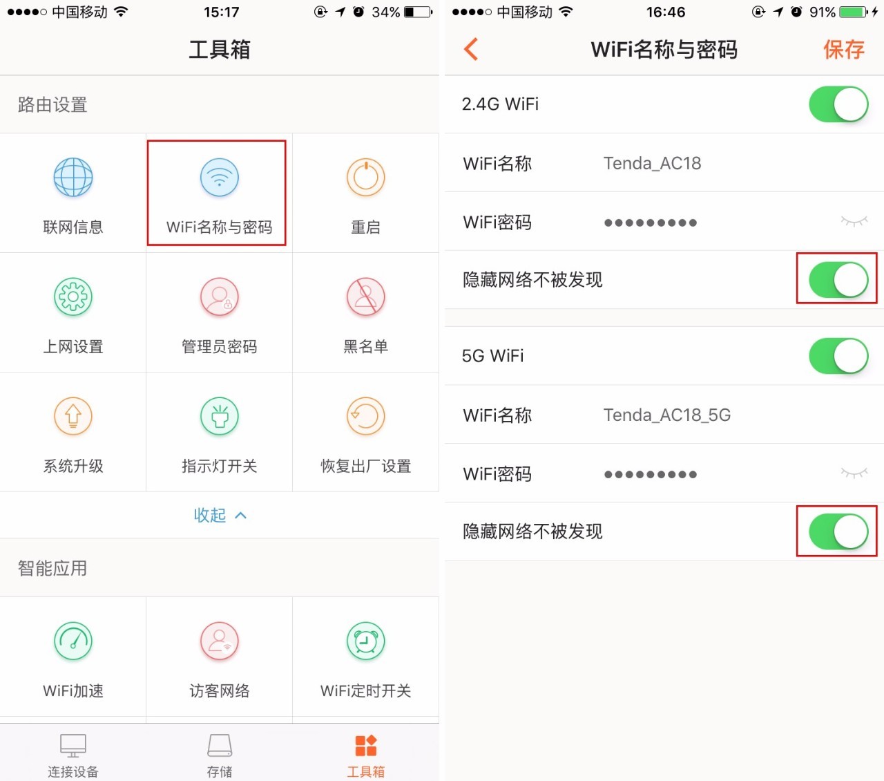 具體的操作也非常簡單,只要登錄路由器辦理界面(騰達(dá)路由器默認(rèn)辦理IP為192.168.0.1),在“無線設(shè)置—WiFi名稱與密碼”里,勾選“隱藏網(wǎng)絡(luò)”即可。當(dāng)然,你也可以直接在手機打開“騰達(dá)路由”APP進(jìn)行隱藏SSID的操作。