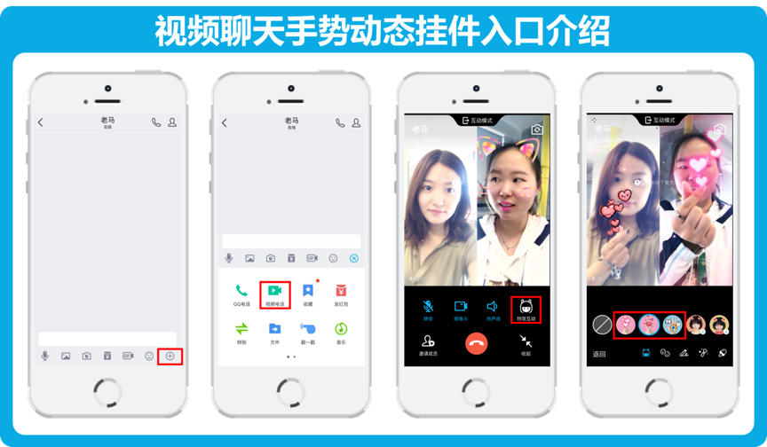 “視頻掛件”已經(jīng)成為年輕人社交中比較常用的娛樂功能,新版本手機(jī)QQ通過AI識(shí)別技術(shù)與動(dòng)態(tài)掛件功能相結(jié)合,實(shí)現(xiàn)多人視頻通話、短視頻錄制添加手勢(shì)動(dòng)態(tài)掛件。用戶在視頻通話,或者錄制短視頻時(shí)可以通過靜態(tài)手勢(shì)觸發(fā)動(dòng)態(tài)掛件特效,如:對(duì)準(zhǔn)屏幕作出比心的動(dòng)作后,屏幕中會(huì)飄出一系列的小愛心,目前視頻聊天和短視頻同時(shí)支持比心和手掌手勢(shì),此外,短視頻還支持托手手勢(shì)。手勢(shì)動(dòng)態(tài)掛件為用戶的視頻社交帶來更多趣味玩法,也將用戶“心情”從面部延展到雙手,,提供更多元的溝通方式。