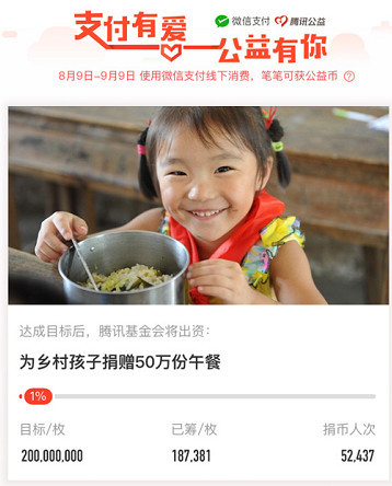 截至 2016 年 12 月,騰訊移動支付月活躍賬戶及日均支付交易筆數均超過 6 億,公益幣項目得以依托龐大的微信支付用戶及商戶群體。如果每個用戶都愿意捐獻一枚公益幣,那么騰訊公益一個月將為孩子們換來 150 萬份午餐。