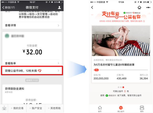 微信支付攜手騰訊公益,上線“捐公益幣”新功能。本日起至 9 月 9 日期間,用戶在使用微信支付線下消費的時,即可收到一份“公益幣”,讓用戶參與到像移動支付一樣便捷的“指尖公益”中。