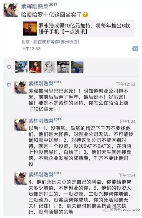 很快,上面這張伴侶圈截圖就流出來(lái)了(上次馬化騰和朱嘯虎互懟也是這么流出來(lái)的),引起了媒體和網(wǎng)友的強(qiáng)烈興趣。終究涉及到的是兩家知名度奇高的公司,無(wú)論錘子還是阿里巴巴。