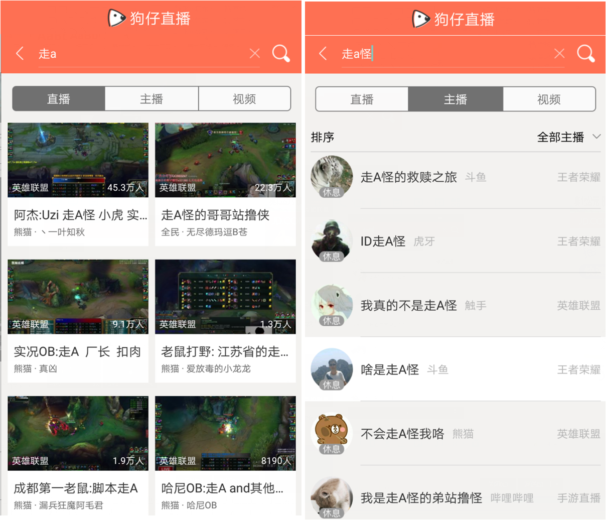至于走A怪現(xiàn)在火到什么程度,前兩天走A怪去某個平臺進(jìn)行了直播,不雅觀眾人數(shù)爆表,數(shù)字比較恐怖。從別的一個角度也能看出來:在狗仔直播APP上( 1 款聚合型直播助手,通過這個APP可以不雅觀看所有平臺的直播)隨便什么時間,搜索一下走A,或者走A怪,你就會發(fā)現(xiàn)不管是主播,還是直播的內(nèi)容,有很多都在和走A怪沾邊,好比下面的兩張圖,就可以很清晰看到